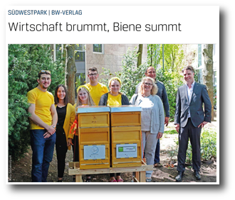 Senatorin Ulrike Sippel, Geschäftsführerin des BW Bildung und Wissen Verlags, siedelt mit ihren Auszubildenden Bienenvölker im Gewerbeareal an.